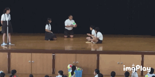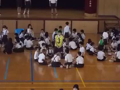 (いつも集会委員の児童が、舞台の上で見本を見せてくれます。)