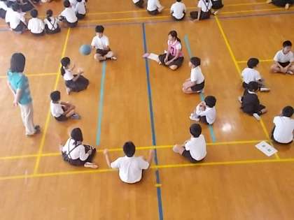 ふれあい班で円になり、音楽が鳴っている間ボール回しをします。