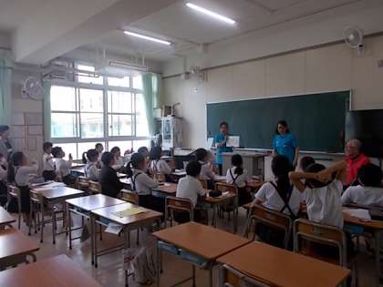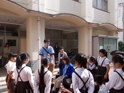 聴覚障がいについて知ろうでは、手話サークルみなとから聴覚障がい者の二方に来ていただき、実際の生活での様子について話していただきました。その後、簡単に表せる手話や手話歌を教えていただきました。みかんとバナナの違いや、自己紹介の仕方など子どもたちは、とても楽しんで学ぶことができました。