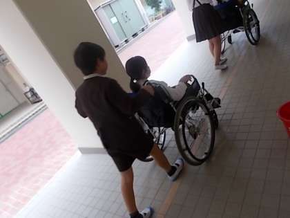 車いす体験では、初めに車いすでの生活についての紙芝居を聞きました。その後、車いすの補助の仕方を教えてもらい、実際に乗ってみてどうかな?押してみてどうかな?と体験をしました。「むずかしいな」「こわいな」「たいへんだ」などの声がよく上がっていました。