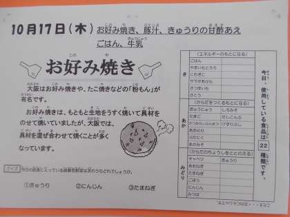 今日はお好み焼きです。ある1年生、「からい」というので、何でかなと思っていると、ソースのかけすぎでした。
