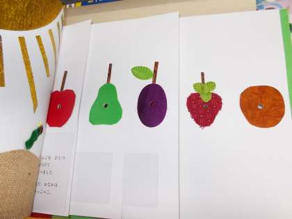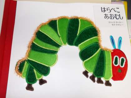 「この本は、みんなの良く知っている「はらぺこあおむし」ですが、この本は手で触って楽しめる絵本です。1冊1冊手作りで作成されたものなのです。どの本もそうなんですが、手を洗って、やさしく触ってくださいね。