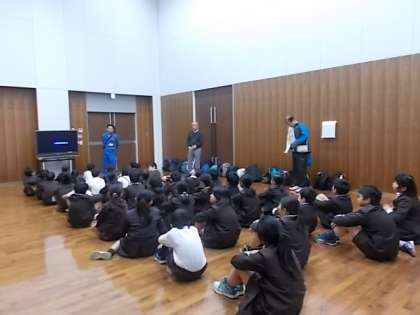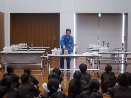 社会科で1学期に学習した安全な飲み水について学ぶために、柴島浄水場へ行きました。まず、「じょう水ジョー」という大阪市水道局のキャラクターが浄水場の設備等を説明してくれる動画を見ました。