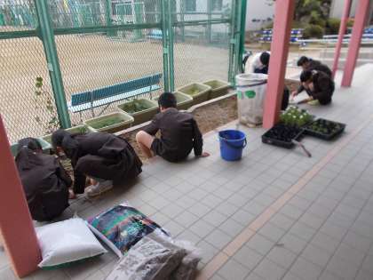 今日は今年度最後の栽培同好会の活動でした。給食室前の講堂側の花壇を整地しました。栽培同好会の児童が朝や休み時間を使って、その花壇に花を植えていく予定です。一生懸命手入れをしています。懇談会にご来校された際に、ご覧ください。また、玄関前もきれいに花が並んでいますのでご覧ください。