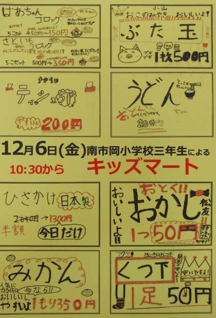 12月6日(金)午前10時30分から繁栄商店街で3年児童がキッズマートを行います。午前11時までとなっています。ぜひお来しください。