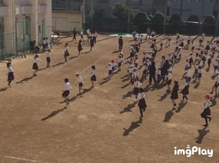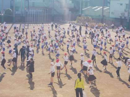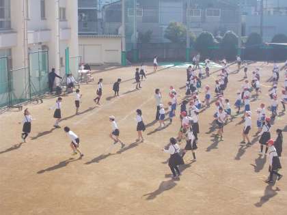 音楽にあわせて、運動委員会の指示した跳び方で跳びます。運動委員会の児童が学年の前に出て、見本を見せています。