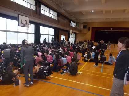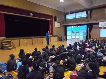 そのあと、講堂に集まって校長先生から阪神淡路大震災や、東日本大震災の時の話から、これからくるかもしれない大地震や、もし、南市岡小学校に津波が押し寄せてきたらどうしたらいいかなどの話もしてくださいました。