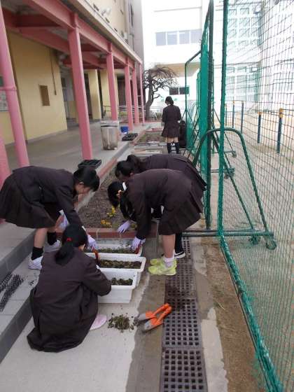 今日は3学期初めての栽培同好会の活動でした。花壇やプランター内に生えていた雑草を抜き、整備しました。さらに、プランターに苗を植え替えました。風が強かったですが、その中でも懸命に活動をしていました。