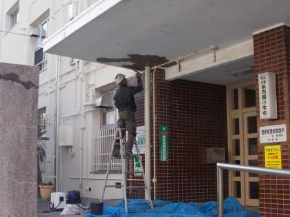 玄関のひさしの工事です。玄関が通りにくくなていますが、子どもたちがいないので良かったです。