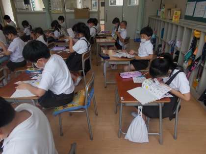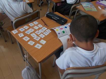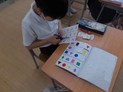 この日は「ABCの歌」を歌った後、この先ずっと使う、ABCのカードをはさみで切り取りました。【写真は3-2】