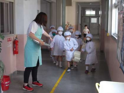 小さな体で、重い食器食缶を運ぶ姿がかわいいですね。ストローやスプーン、牛乳は子どもたちが配っています。