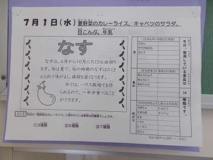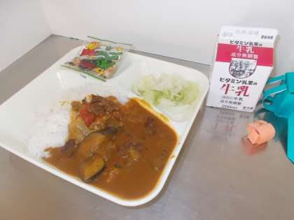 夏野菜のカレーです。高学年の児童でも、ちょっと辛かったようです。