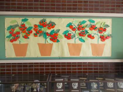 2年生の作品「ミニトマト」です。1人1枚の葉っぱと、1個のミニトマトを、画用紙と折り紙で作りました。おいしそうです。全員の分があります。
