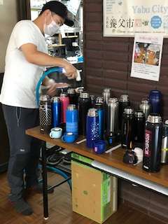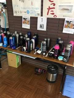 食堂前に水筒をきれいに並べます。谷常さんが、入れてくれます。