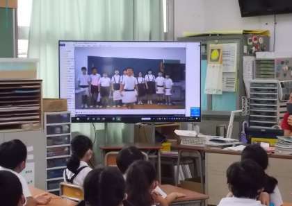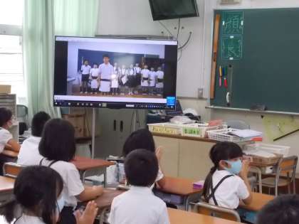 今年初めての児童集会です。体育館で一斉に行うと密になる恐れがあるので、あらかじめとっておいた動画を流しました、第1回目は、集会委員会の自己紹介でした。