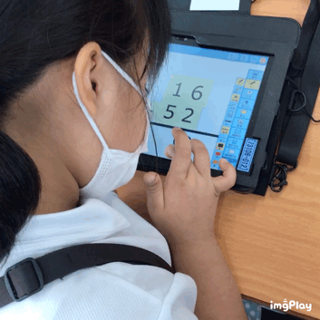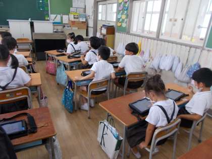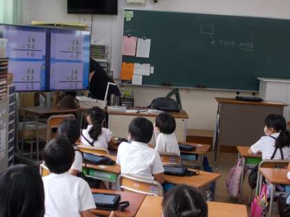 2年生は初めてタブレットを触りました。(去年も触っていません。)自分や友達のタブレットの画面が、大型モニターに映し出されています。(写真は1組です)