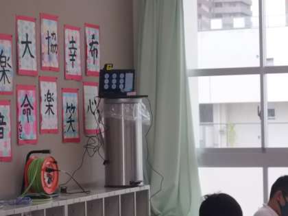 今回も試験的に実施しました。前半15分間(運動場側)と後半15分(廊下側)で定点カメラの位置を変えて配信しました。(ゴミ箱の上において、少しぶさいくですが…)