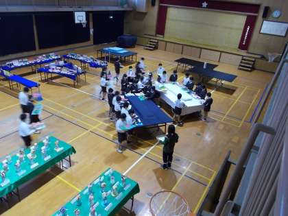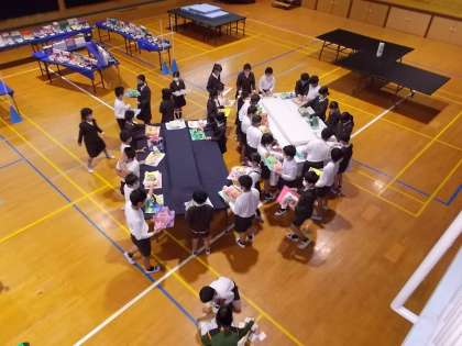 作品ができあがりました。全学年、順番に立体作品を展示しました。(写真は4年)