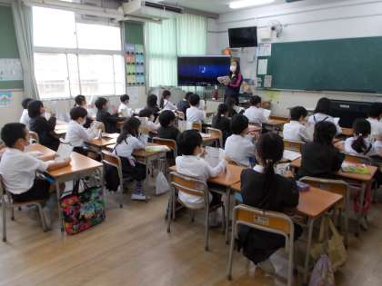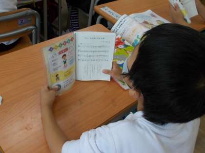 今日は教室で校歌のCDを聞いて、覚えてようと頑張っていました。