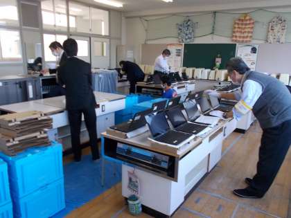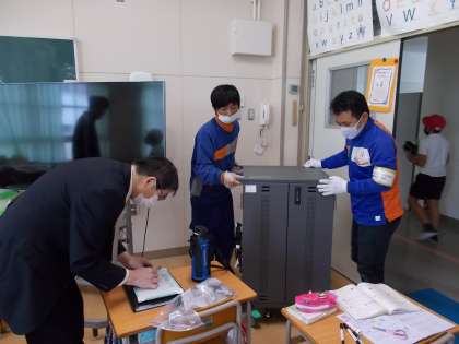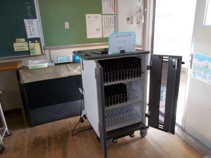 1人1台学習者用端末(ノートパソコン)を業者にセッティングしていただき、教室に人数分のパソコンが収納できる保管庫が設置されました。