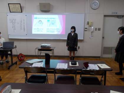 児童健康委員会の発表は、感染症予防には手洗いが大切なことや、健康委員会の活動内容を中心に発表しました。発表内容は1月の児童集会で全学級に放送します。