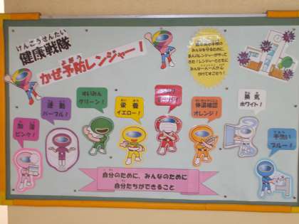 今月の掲示物は・・・「健康戦隊 かぜ予防レンジャー」が登場しました。