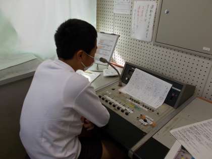 放送室から、放送で発表します。顔が見えないので、はっきり、ゆっくり、ていねいに発音しないと伝わりません。今日は4〜6年生の練習でした。