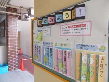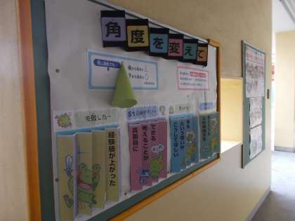 2月の保健室前掲示物は「角度を変えて見てみよう!」です。左側からと右側では見え方がちがいます。