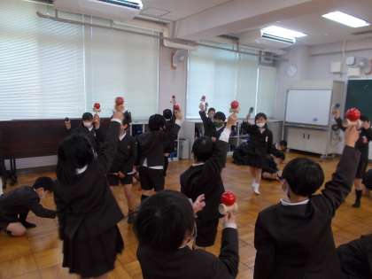 基本技10種を披露していただき、持ち方、体の使い方など、丁寧に教えていただきました。そして、「たこやき1丁」というゲームを教えていただきました。