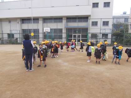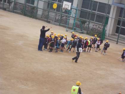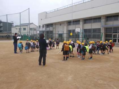 運動場で地区ごとに並んでから、かたまり下校しています。
