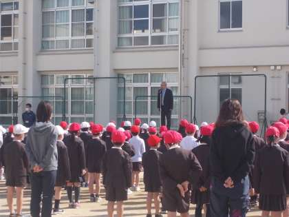 「学校での約束を今、しっかりと身に付けてほしいと思います。今日担任の先生から話があると思いますが、「南市岡スタンダード」という学習の約束をまとめたものがあります。筆箱の中身やお道具箱の中のこと、授業中の発表の仕方などです。これは1年間使うもので、大切な約束事です。わからないことは、学校のお手本となっている5年生や6年生に尋ねてみてくださいね。」