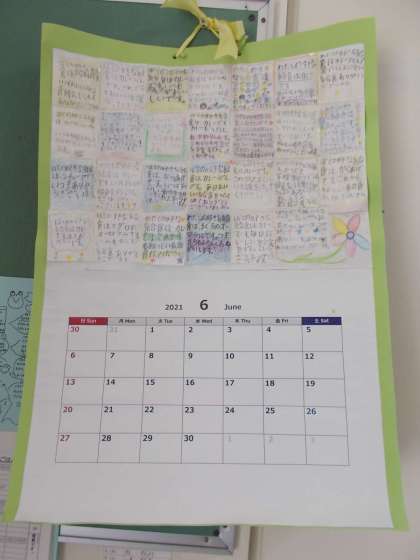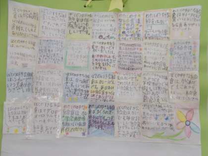 去年の3年1組の児童が、給食調理員への感謝の気持ちを込めてかいたメッセージです。