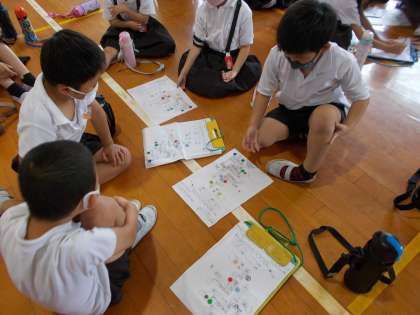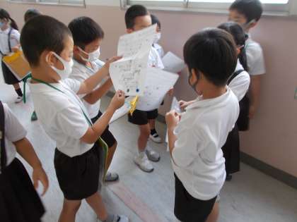 1・2年生が一緒に学校探検を行いました。2年生は1年生に校内の教室を紹介しながら回りました。校内に貼っている暗号を見つけたり、地図にシールを貼ったり、グループで楽しそうに活動していました。