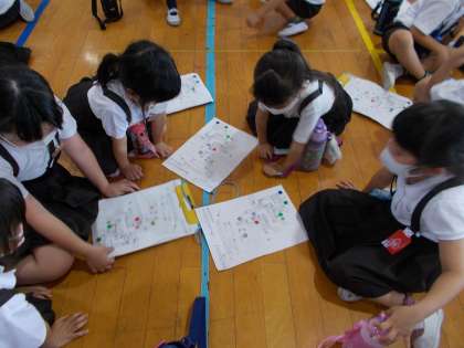 講堂では、暗号を並べ替えて、キーワードを見つけ出しました。これからもたくさん低学年での活動を行っていきたいと思います。