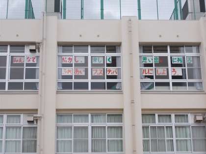 明日、2年ぶりのふれあいフェスティバルです。児童会のめあてを図書室の窓に掲げています。