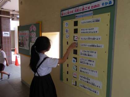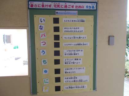 蒸し暑い日が続いています。7月の保健室の掲示物は、「暑さに負けず、元気に過ごすための9か条」を貼りました。