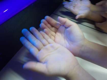 実験のクリームをつけて洗いに行き、箱の中に手を入れると洗い残しがある部分が光ってみえます。