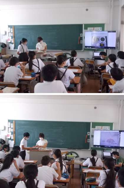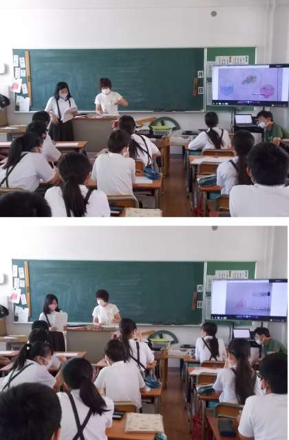 夏休みの宿題で考えた、給食献立メニューを発表しています。