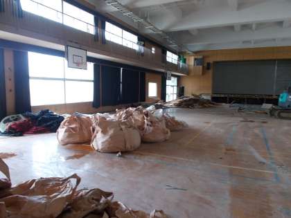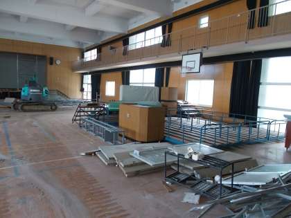 プールの方の解体が終わり、講堂の中の床をはがしにかかっています。