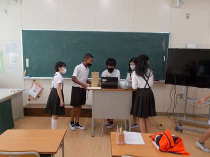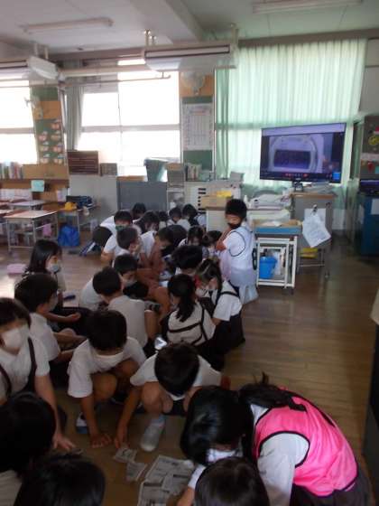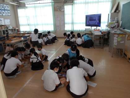 そこで、高学年ルーム(集会委員会:写真1枚目)と、ふれあい班の教室をClassroomで繋ぎ、リアルタイムで集会委員会がゲームの進行をしました。初めての試みです。