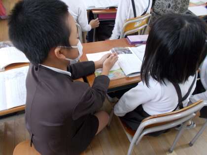 となりの人と意見交流して、さらに自分の考えを深めます。【写真は2-1】