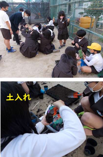 3・土を入れたビニルポットに指で穴をあけて、そおっと植え替えます。
