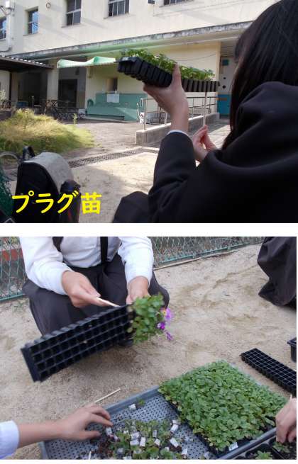 今日は、ビオラ、パンジー、ナデシコのプラグ苗を、ビニルポットに植え替える作業です。