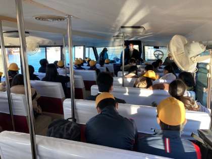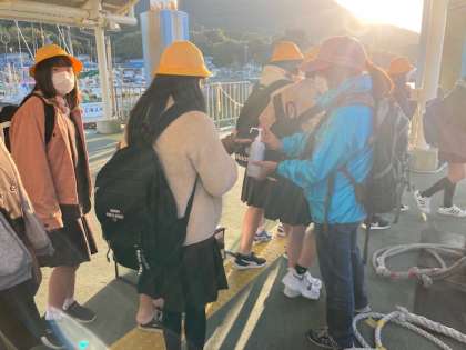 菅島での体験は終了です。消毒をしてチャーター船に乗り込みます。みんな元気です。