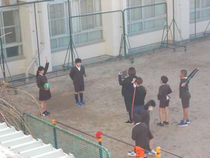 集会委員の児童が運動場で「○○できるでしょうか?」と問いかけ、児童が実演し、できたら○、できなかったら×というゲームです。