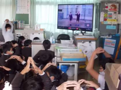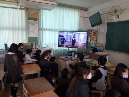 ふれあい班のみんなは、教室のモニターを見て○か×を手で表していました。