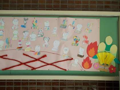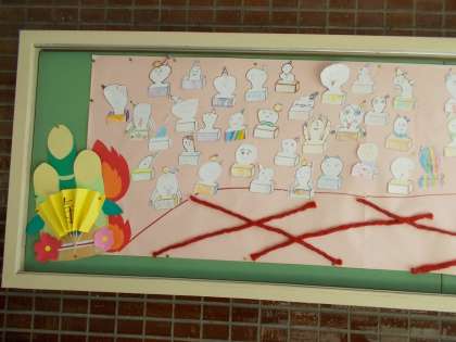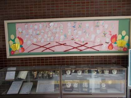 1月の玄関掲示は1年生の作品です。全員作りました。