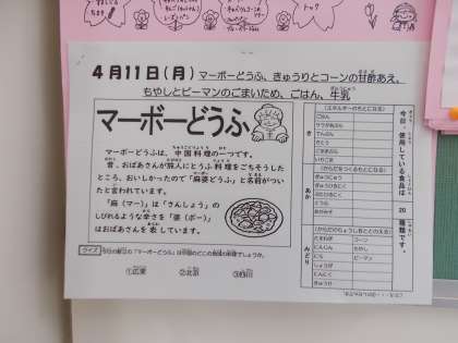 1年生にとって記念すべき「初めての給食のこんだて」は、マーボーどうふでした。