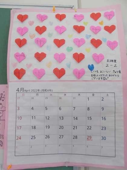 【写真3枚目】…給食室にあるカレンダーです。調理員さんに感謝の気持ちを込めて作ったカレンダーです。4月は去年の2−2が作りました。