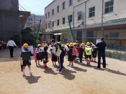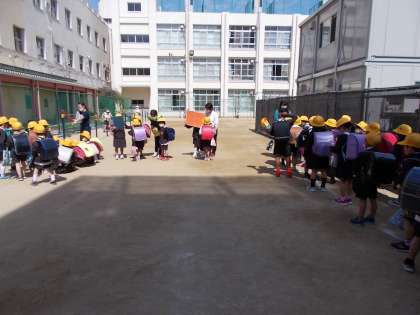 運動場で地区ごとに分かれてから職員が引率します。